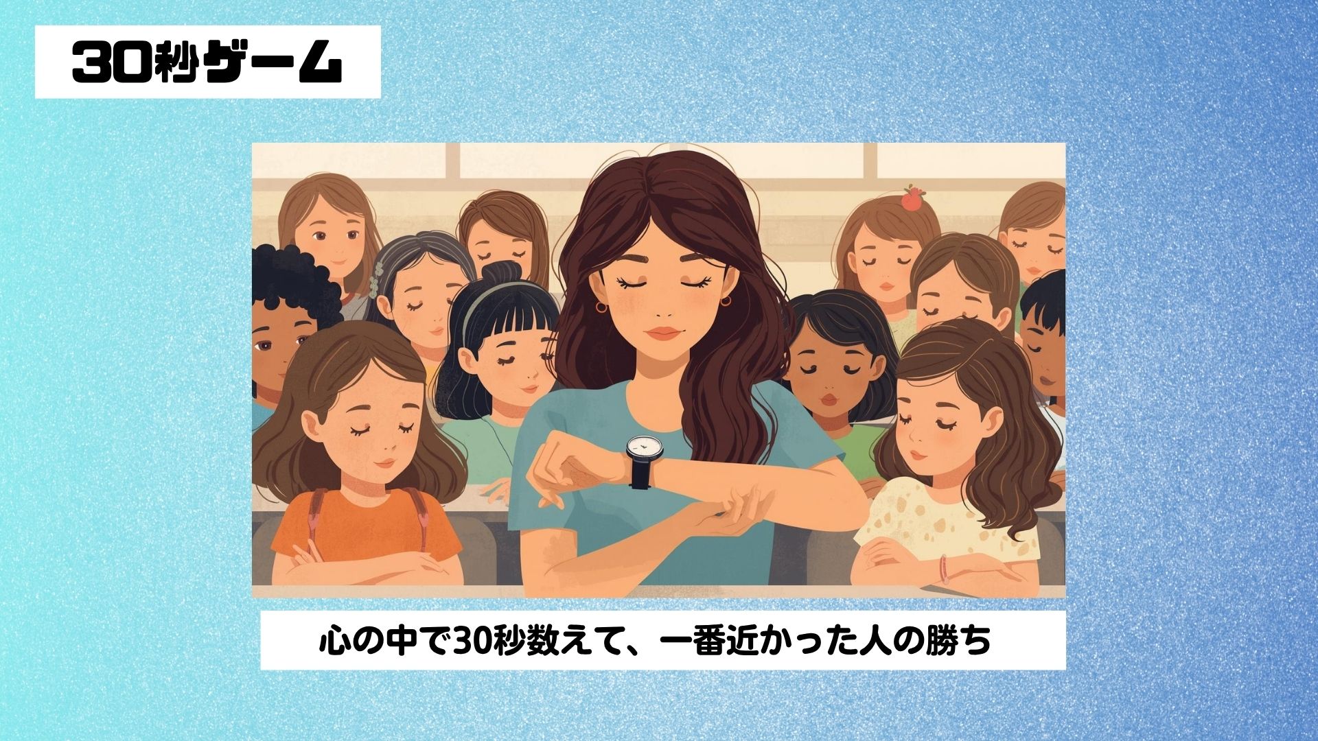 今から30秒ゲームをします。顔を伏せて心の中で数え、ぴったり30秒だと思った瞬間に黙って手を挙げてください。途中で声を出したら負けですよ。では、よーいスタート