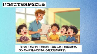 レク・ゲーム 学級レク「いつどこでだれがなにした」 おもしろ短文に大うけ!低学年は作文の練習にもなります!!1年生は国語の時間、文を書くには「いつ」「どこで」「だれが」「なにした」を意識して書くことが大切だと習います。それを楽しみながら学べるのがこのレク。子供でも気軽にできるので、バスレクな... 2025.10.08 レク・ゲーム授業で使える言葉遊び,クイズ