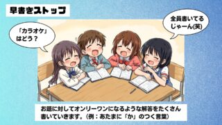 レク・ゲーム 学級レク「早書きストップ」 概要:お題に対してオンリーワンになるような解答をたくさん書く 今回は紙とペンだけで簡単にできて、語彙や知識も増やせるというゲーム「早書きストップ」を紹介します。5分もあれば1ゲームできますので、授業中のちょっとしたスキマ時間にもオススメです... 2025.10.11 レク・ゲーム5分でできる授業で使える