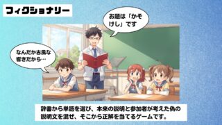 レク・ゲーム 学級レク「フィクショナリー」 概要:辞書から単語を選び、本来の説明と参加者が考えた偽の説明文を混ぜ、そこから正解の選択肢を当てるゲームです。 国語の時間の導入やスキマ時間におすすめ!!楽しみながら、知らなかった言葉を知ることができますし、表現力や想像力を磨くこともできる... 2025.10.12 レク・ゲーム授業で使える言葉遊び,クイズ