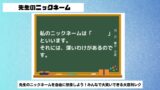 発表では、子どもが先生になりきって読み上げる姿にクラス中がほっこり。最後に先生自身の昔のニックネームを明かすと、さらに距離が縮まる楽しいコミュニケーション活動です。