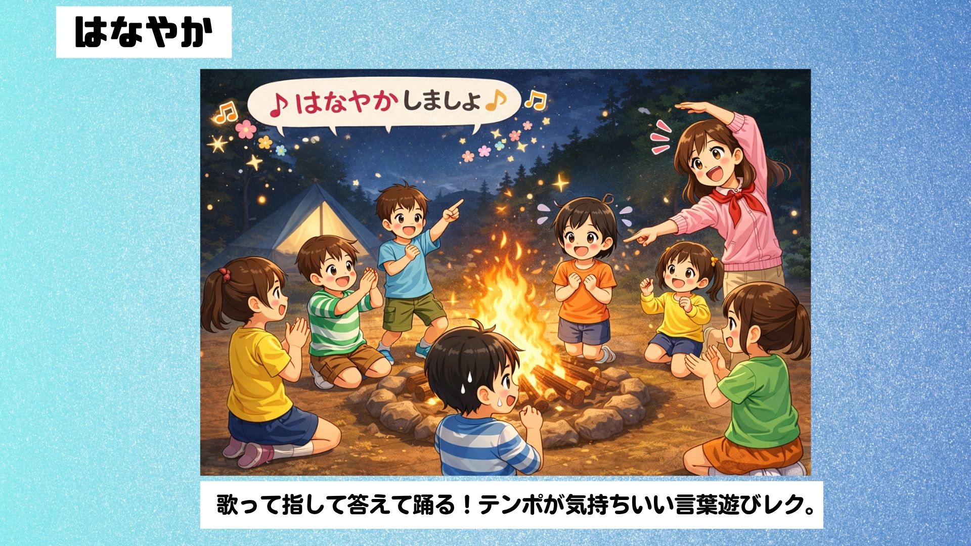 踊りは自由で、オーバーな動きほど盛り上がります。暗くても楽しめるため、キャンプファイヤーでのレクにも最適です!