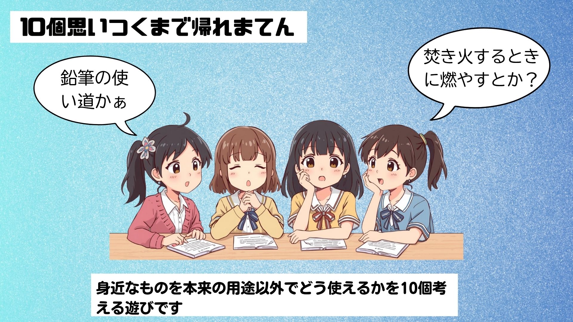 今回は、子供たちの柔軟な発想力を高められるレク「10個思いつくまで帰れまてん」を紹介します。これは、身近なものを本来の用途以外でどう使えるかを10個考える遊びです。