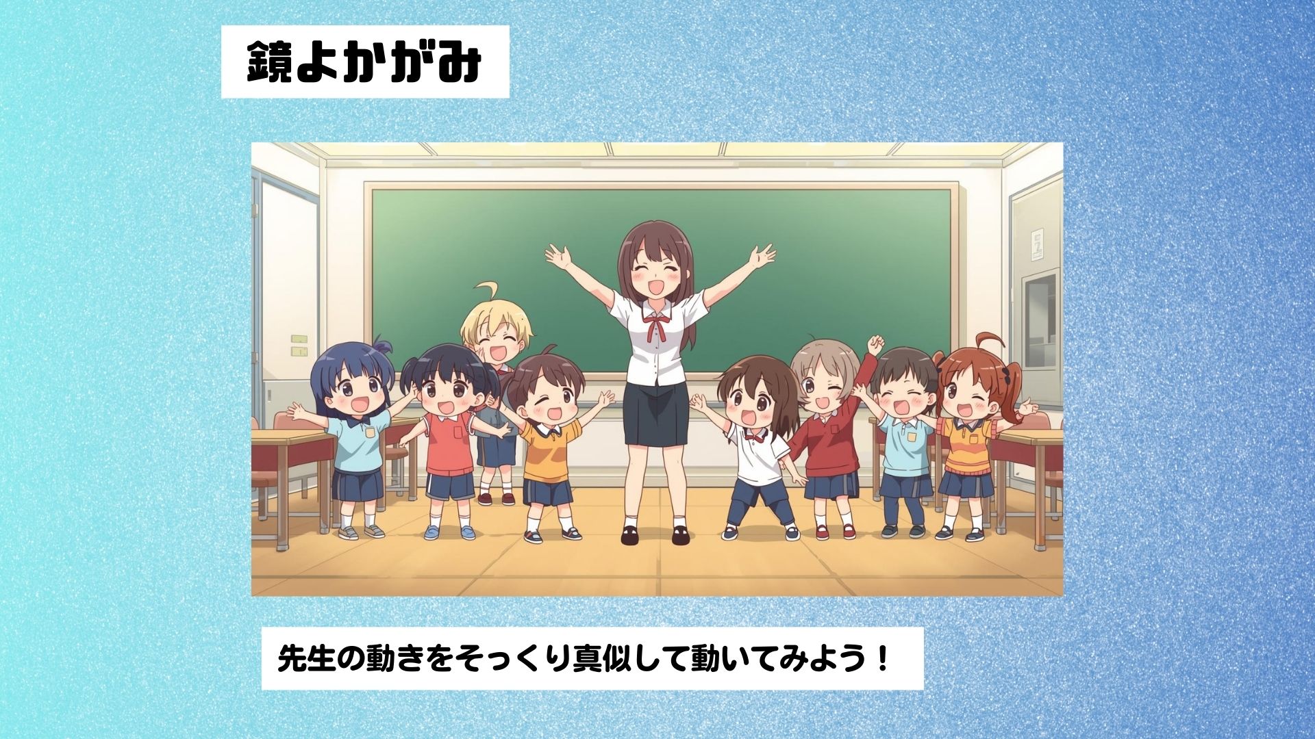 そうです。みなさんには先生を映してもらいます。よーく見てくださいね。鏡ですから、お話はできませんよ。では、鏡よかがみ~!!