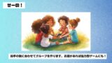 参加するためのハードルも高くないため多くの子が参加しやすいです。難易度は高くないのに、成功するとうれしいゲームです。会話のあり/なし、ジェスチャーのあり/なしなどの制限を設けることで、意思疎通の仕方について考えることもできますよ。
