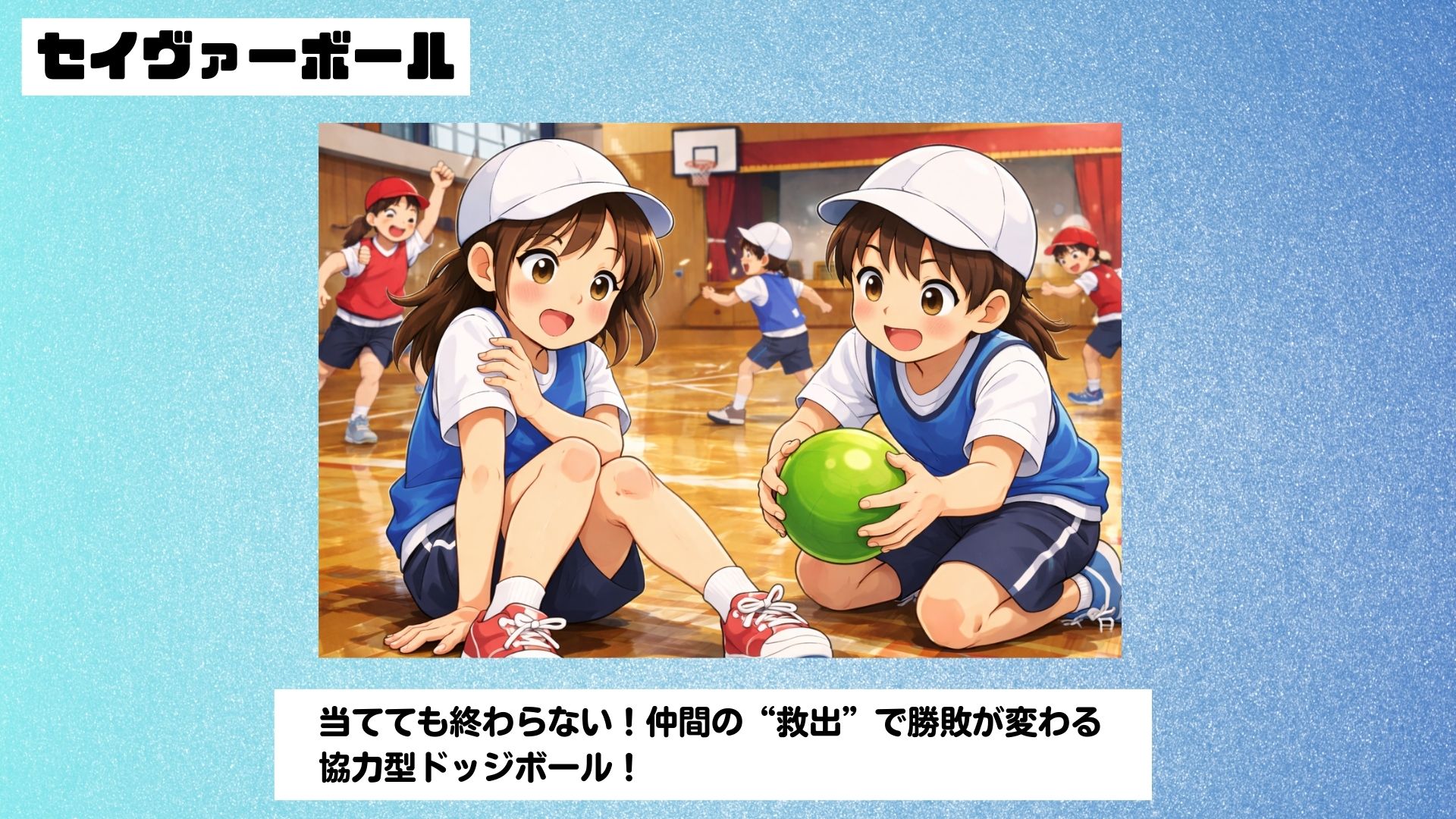 「セイヴァーボール」は、ドッジボールのように相手にボールを当てるだけではアウトにならない、ひとひねり加えたレクリエーションです。
