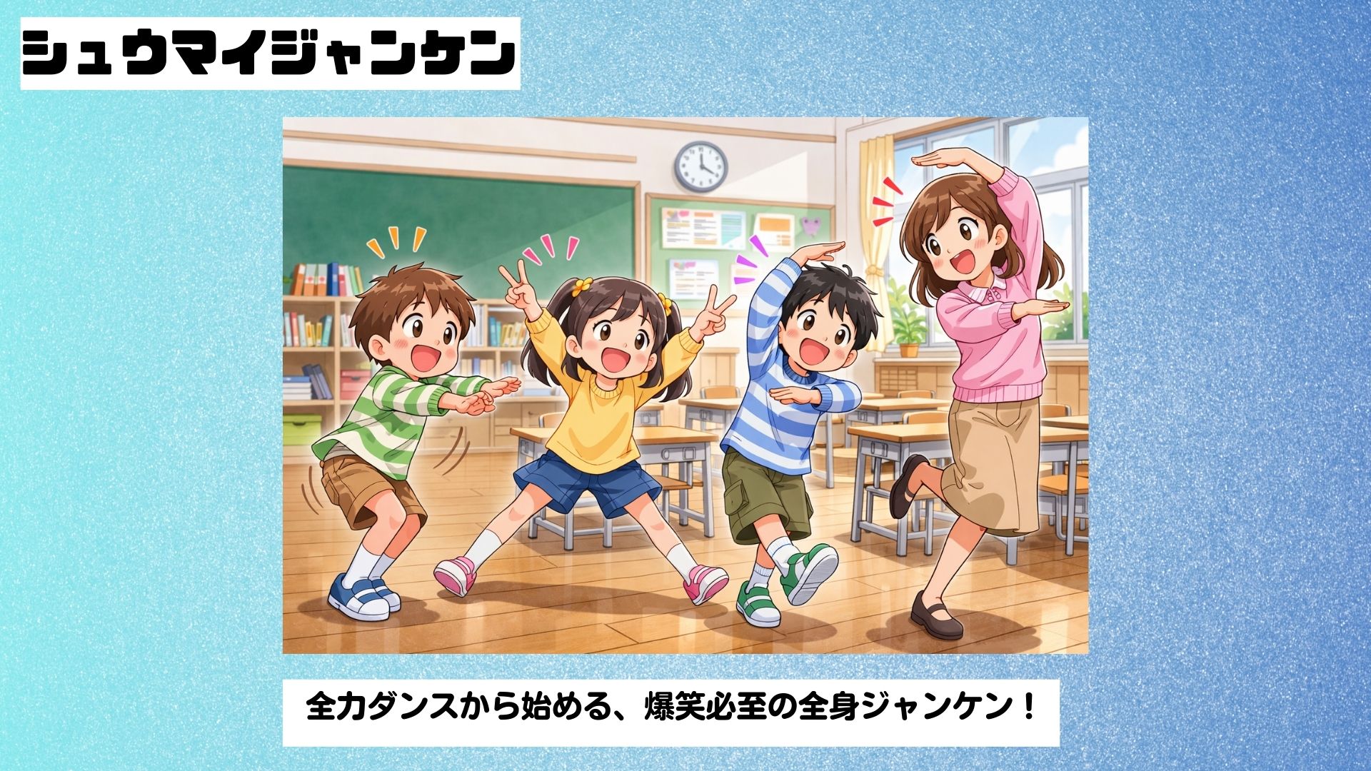 特に「シュウマイシュウマイジャンケン!」と全員で叫びながら踊る前ふりが盛り上がりのピーク。担任と同じポーズを出したら負けというシンプルなルールで、低学年から高学年まで楽しめます。とにかく全力でやるほど面白くなる、笑いの絶えないレクです。