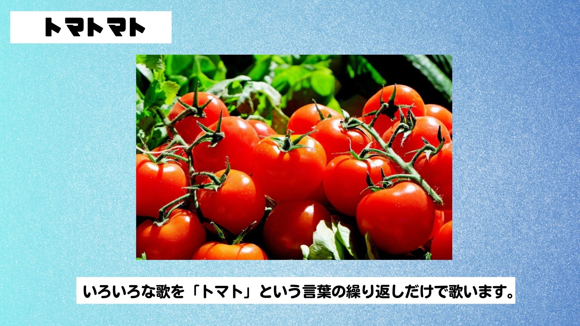 概要:いろいろな歌を「トマト」という言葉の繰り返しだけで歌います。