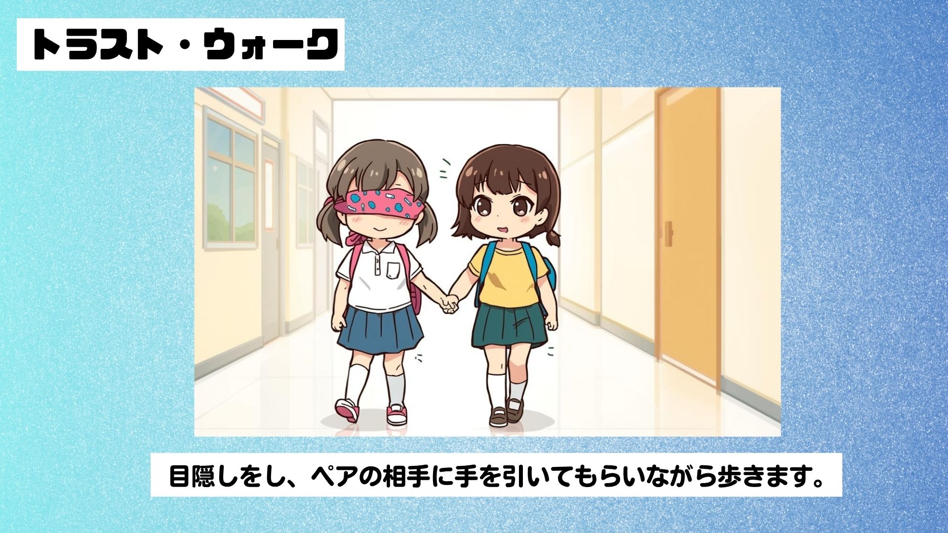概要:目隠しをし、ペアの相手に手を引いてもらいながら歩きます。