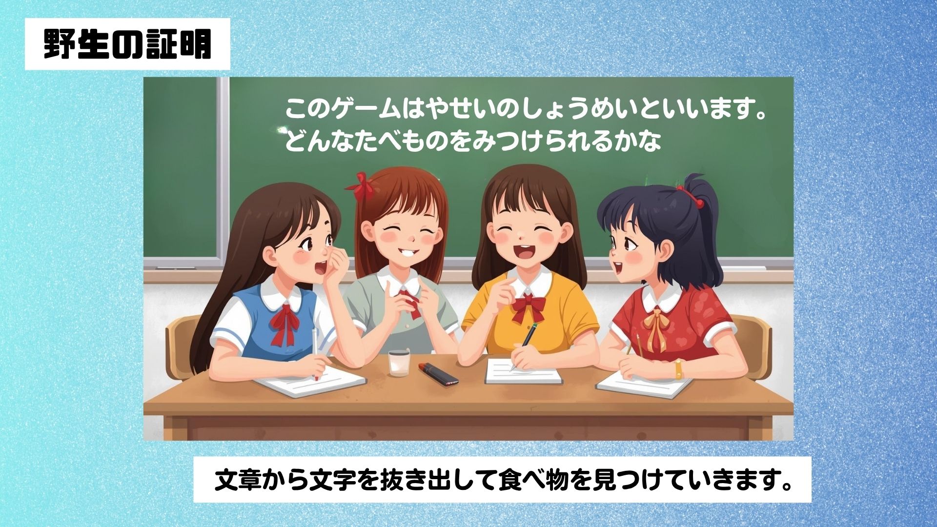 「このゲームはやせいのしょうめいといいます。どんなたべものをみつけられるかな」